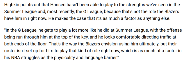 “在发展联盟的赛场,他的打法更贴近夏联的状态:进攻端由他在罚球线顶端发起,无论攻防两端,他指挥球队进攻的表现都显得游刃有余。这也是开拓者最终想要打造的他的比赛方式,但球队目前的阵容配置,还无法让他承担这样的角色——这一点,与身体对抗强度、语言障碍一样,都是他在NBA赛场挣扎的关键原因。”
